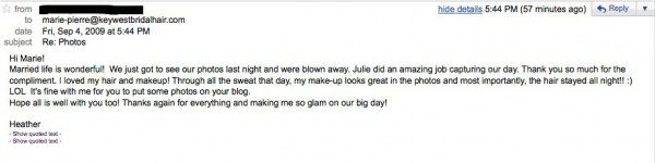 Saturday September 5, 2009 CLICK SCREENSHOT TO ENLARGE Heather may have been undecided about her wedding attire and even had a change of heart in the middle of it all, but there was one thing she knew for sure, she wanted to be all *glammed* up. We went all out, the result is simply fabulous. BTW […]