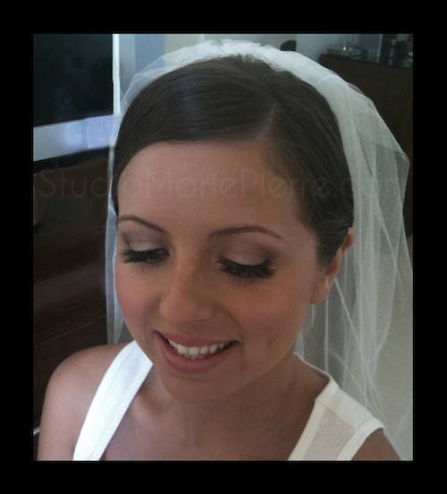 Randie’s foundation and blush were airbrushed to enhance her already angelic complexion and give her fresh rosy cheeks.  I wanted the focus to be on her big green eyes and opted to create a light smoky using a combination of vanilla, mauve, and gray eye shadows.  Randie already had very long lashes so I decided to match her length and  focus on thickening the lash line.  That method of application emphasized even more her eye shapes.  The lips were kept natural and glossy.